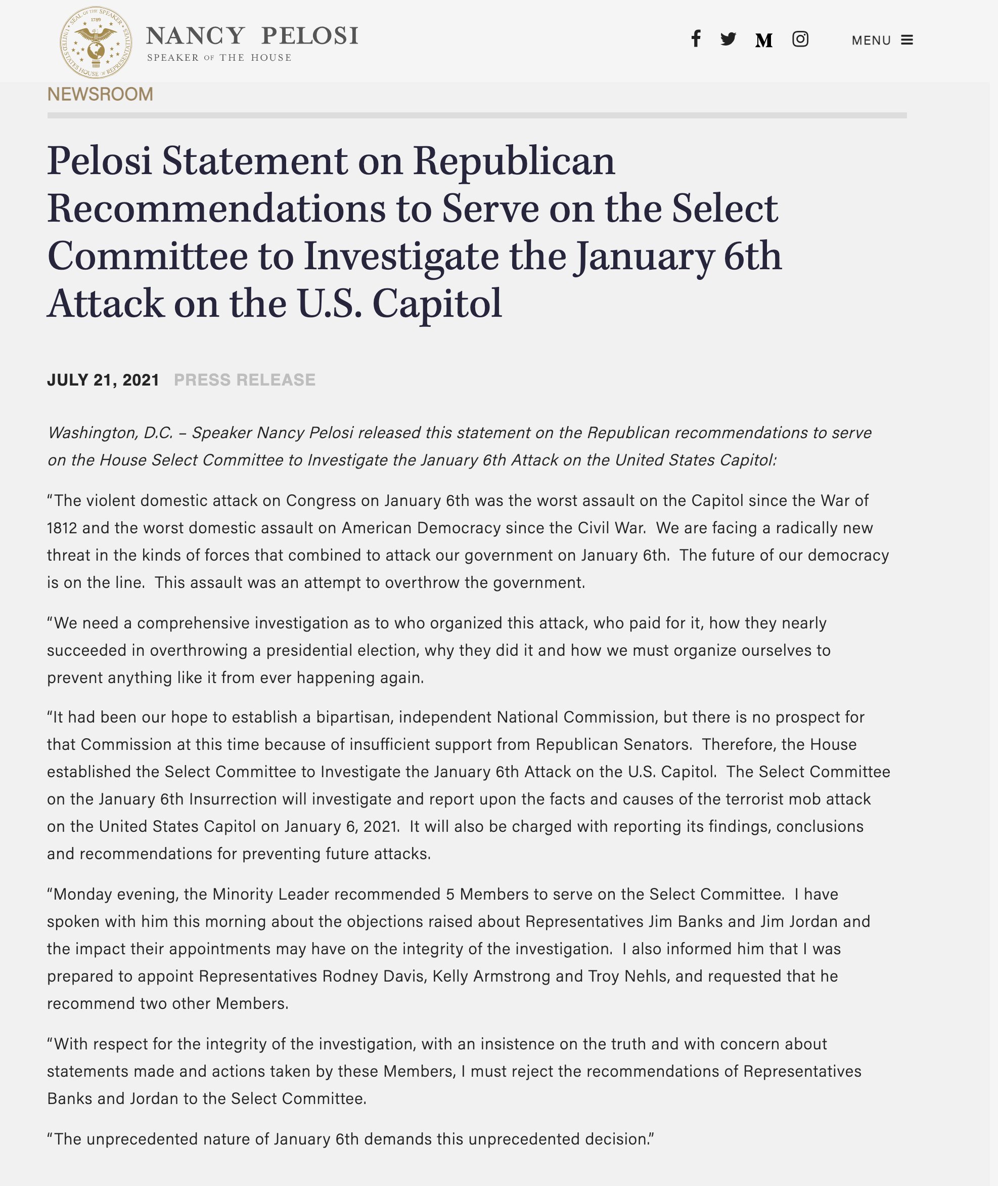Jim Jordan in particular was a target of the investigation. His serving on the committee would compromise the integrity of the investigation. Pelosi approved three of the members chosen by McCarthy and asked him to select two others. He only had 200 other Republicans to choose from. Instead, he pulled all his selections from the committee.flockofseagulls104 wrote: ↑Wed Jun 29, 2022 9:58 pmThey wanted THEIR Republicans on the committee. They had no interest in having any cross-examination or any questioning..